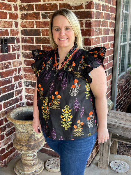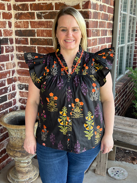 Botanical print short flutter sleeve top featuring pintuck bodice with embroidered trim V-neck. Unlined. Woven. Non-sheer. Lightweight.