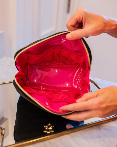 This beautiful quilted nylon pouch is part of our makeup and travel collection and features a stylish quilted fabric design. The elongated zipper provides easy access, making it perfect for organizing makeup, toiletries, and hair accessories. The spacious interior is lined with hot pink with a clear protective fabric that is easily wipeable. It also has mesh pockets to keep cosmetics neatly stored and accessible.