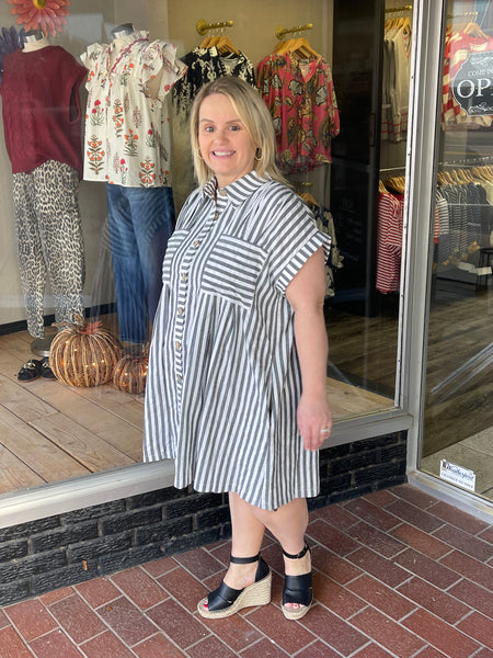 Stay effortlessly chic in this Cotton Striped Button Down Tunic Dress. Crafted from a breathable cotton fabric, this dress offers a lightweight and comfortable feel, perfect for warm days. The timeless striped pattern and button-down front add a touch of sophistication, while the relaxed tunic silhouette ensures easy, versatile styling. Wear it as a dress with sandals or layer it over jeans or leggings for a laid-back yet polished look
