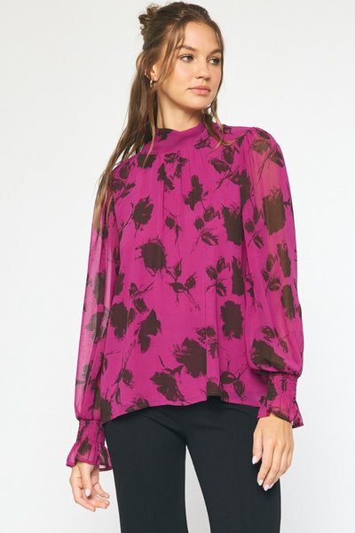 Floral print mock neck long sleeve top featuring self-tie at back neck. Ruffle detail at cuff. Lined. Woven. Non-sheer. Lightweight.