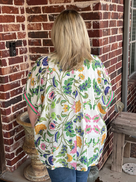 Floral print short sleeve top featuring contrast trim at V-neckline and sleeve edge. Unlined. Woven. Non-sheer. Lightweight.