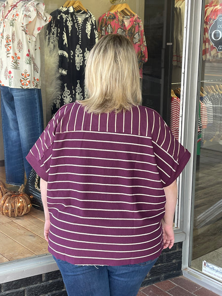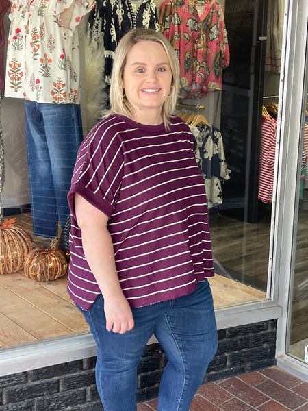 French Terry Striped Rolled Sleeve Knit Tee - Plum