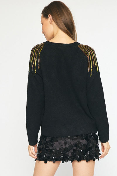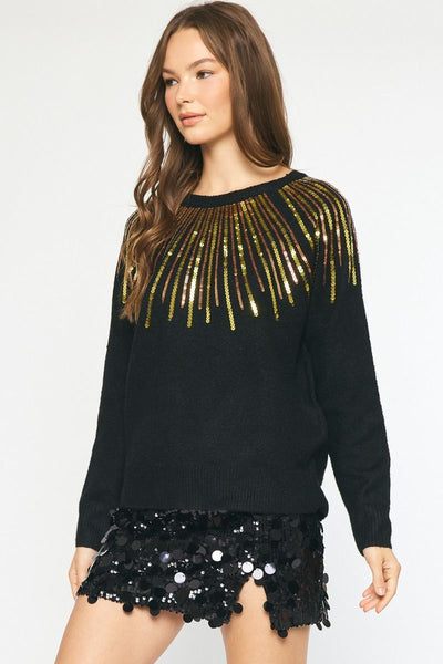 Solid round neck long sleeve sweater featuring sequin detail at front. Unlined. Knit. Non-sheer. Lightweight.