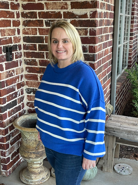 Striped Round Neck Pullover Sweater - Blue