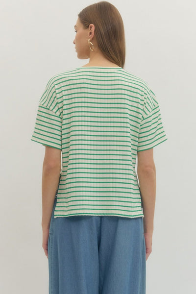 Solid short sleeve knit top featuring textured stripe pattern. Side slits. Unlined. Knit. Lightweight.